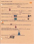 The journal was created after many years of me begging for the teacher to write something in his book other than “Fine day overall” (one of my favorites). I wanted to be able to have a conversation, as much of a conversation as possible, with DC about his day. I wanted him to understand the question. If I wasn’t told about specific things that he had done on that particular day, and took his standard responses as fact, or guessed at what he had done and was wrong, he would never be able to understand the question. Other than lunch, the rest of his day is described with standard answers. Some of these answers may have been the truth at some point, but I am sure they are not the list of things he does everyday. Once he comes up with an answer, that is the answer I will get every day.
