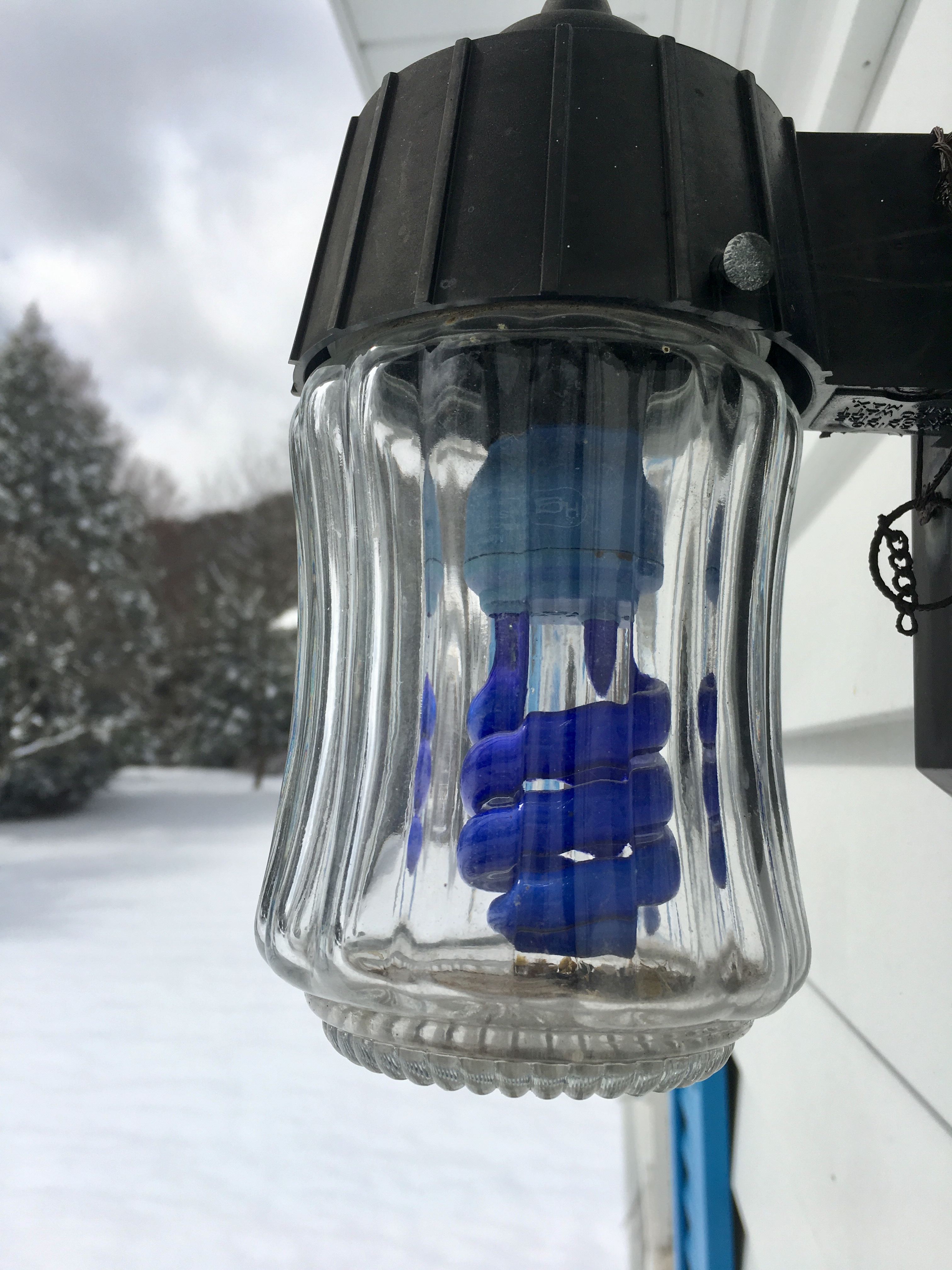 I have a blue light. It is one of those energy saving bulbs that lasts what seems like forever. It has been in my outside porch light for a good 4 (maybe more) years now (and yes, I did notice that there are plenty of dead bugs at the bottom in this photo – that’s life.)