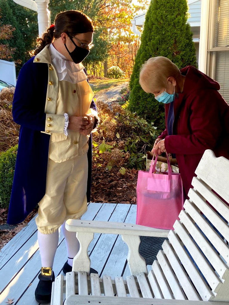 Mrs. H stopped by today to drop of Halloween treats for DC. He was so happy to be able to see her today (he hasn’t seen her since March, when the world closed down). He was also happy for the treats. Last week his Aunt Lisa dropped off a Halloween bag of treats, including a new package of fake mustaches. Then we have the multiple band-aide packages that came in for him from my friend Amy in GA. (You know how Amazon takes one order and ships it in many boxes on many different days? – Well that shipping technique worked out just fine with DC). I am thankful for the people who understand just how important Halloween is to this boy and helped to make it a little more special for him this year.