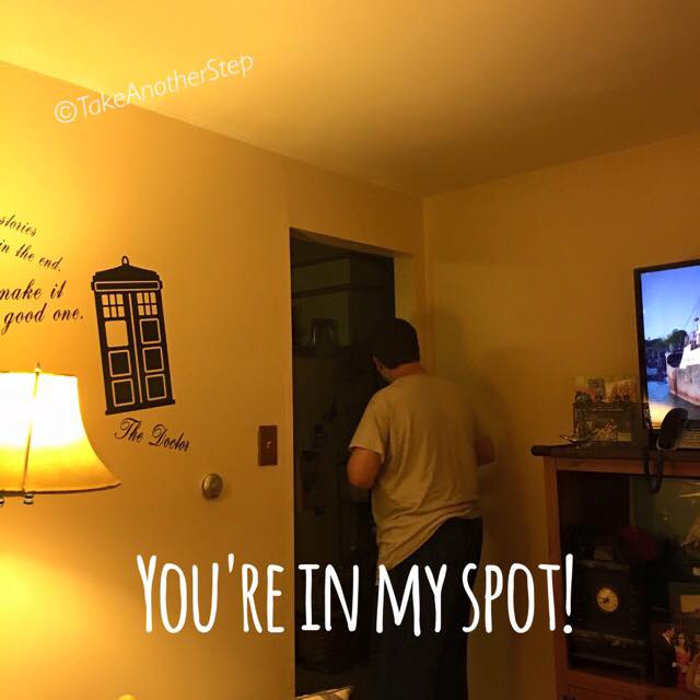 We all know that DC has his “spot” at the kitchen table. No one can sit in his chair, nor can one put anything down in his spot. Next to his spot is another chair that holds the books he must have beside him when he is in his “spot” (so technically he had two spots).